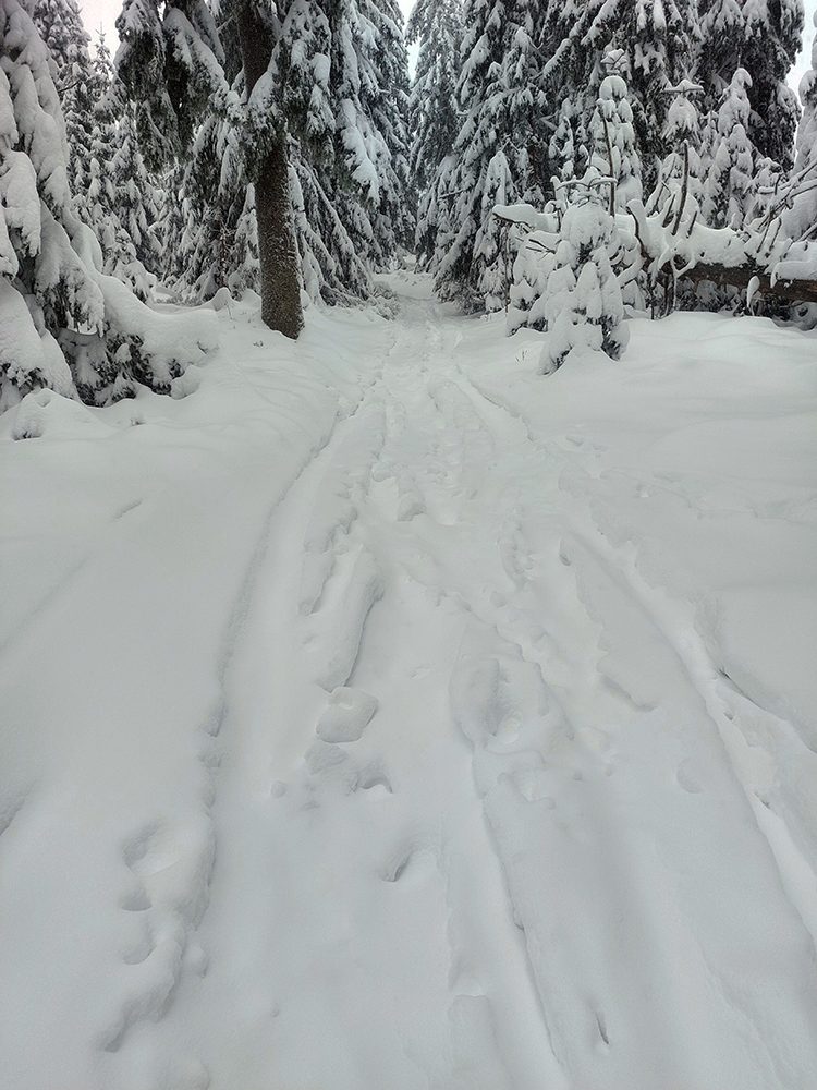 Potom už začala pravá zimná almázia. Medvedia cesta nádherná, štvrtkový odmäk a následné jemné prisneženie v kombinácii s mnohými nohami ju pekne vytvrdili - aj zjazd bude bezpečný pre sklznice. Okolo zimná rozprávka, čím vyššie, tým krajšia. Pri východe z lesa na Vlkolínske lúky pod Sidorovom obzretie doľava – zdalo sa, že zjazdiť by sa dalo aj po ceste. Stopa ďalej už ležala v hlbokej koľaji, hranica mrakov sa zhora blížila a jedinými farbami v okolí boli špičky šípiek na turistickom ukazovateli: