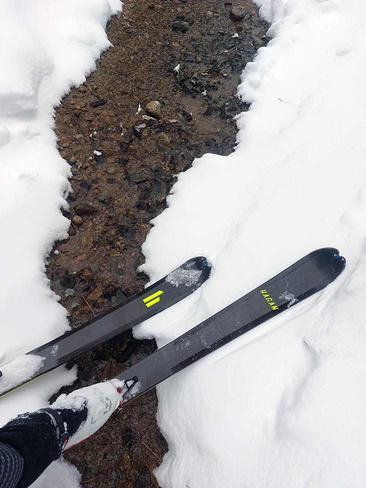 Prvá improvizácia hneď na chodníku do Hrabova: normálne by sa to dalo na pásoch, aj v lese snehu dosť a pekne utlačeného. Skoro nič netrčalo, aj tie prechody cez pramienky vysnežené – takto začiatkom zimy som to ešte nezažil, dobre to začína! Ale keď už boli lyže na batohu, neriešil som, aj tak bude treba prenášať cez parkovisko. Len som si zafixoval, že ak by som cestou nazad náhodou nestíhal ku vlaku, môžem sa tu zrýchliť.