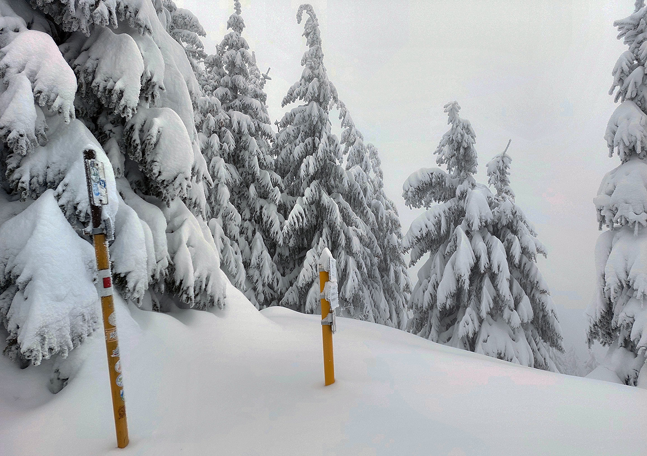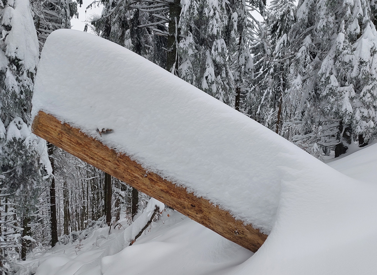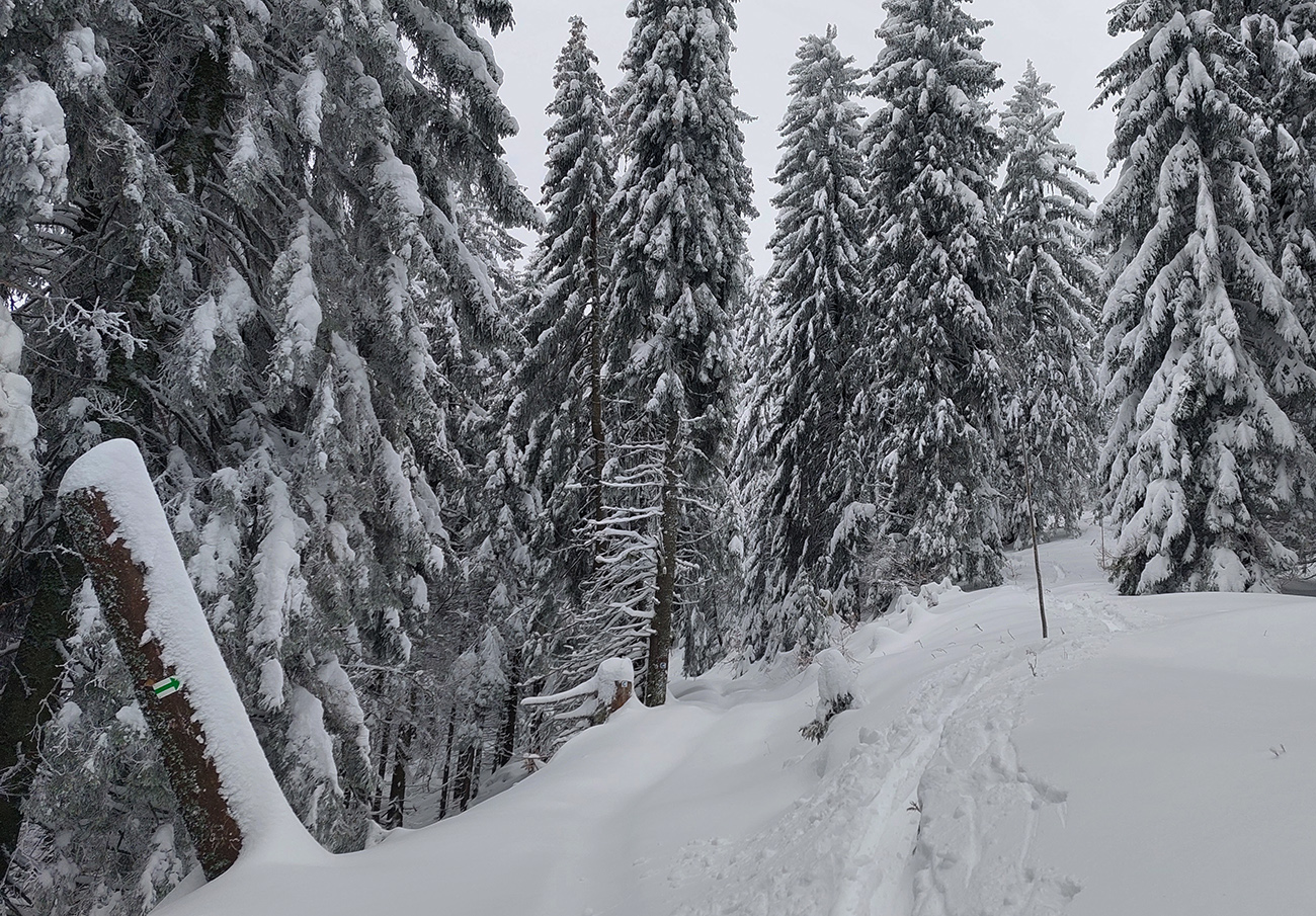 Na serpentíne stopa viedla rovno hore, tak som skúsil doľava, že preleštím cyklotrasu – asi päť cm v noci padlo do prechodenej stopy. Aj tiež jeden statný smrek – tam už to podliezanie také jednoduché nebolo, a ešte na lyžiach. Len také okienko pomedzi vylomené konáre. Inak cesta jedna paráda a okolie ako v zimnej rozprávke.