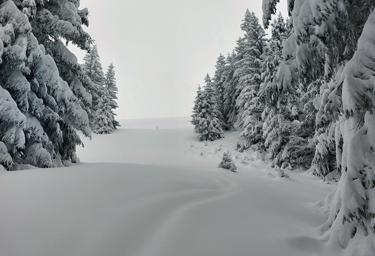 Sedlo pod Vtáčnikom ešte len čakalo, kto ho prvý poorie. Ufúkaný, hutný, ale čerstvý sneh ponúkal kompaktné a predvídateľné podmienky, aj keď zhora sa už približovali mraky a difúzka začínala skrývať detaily. Palice už som pichal dobre vyše pol metra, miestami nebolo o čo ich oprieť - a raz to aj tak dopadlo (doslova, hehe). Do mäkkého, len sa ťažko vstávalo. Predjazdci stúpali hore po zelenej, tak som zase pokračoval v leštení cyklotrasy. Priesek, ktorý na ňu padá z lúk pod Šiprúňom, priam vábil poriadne ho počmárať.