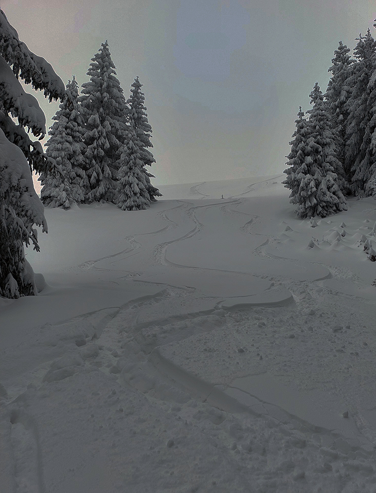 Ešte ostalo času do odjazdu, tak na záver ešte raz hore k lanovke, známym cikcakom lesom. Stopa v čerstvom snehu parádna, hlboká, len pozor! Miestni pretekári ju natiahli ako vždy strmo. Alebo len mojim pásom už končí život?